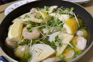 筍と牡蠣と海老のアヒージョ!