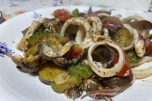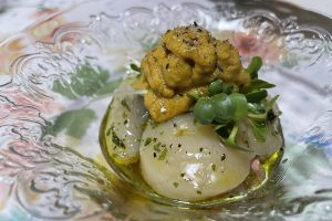 ホタテと金目鯛とウニの出汁オリーブオイル和え
