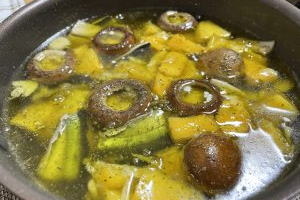 柿とマッシュルームとサンマのアヒージョ