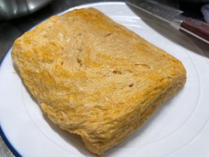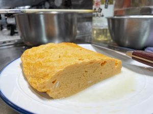 出汁の種類を説明し、今回は1番出汁をとり、だし巻き卵を作りました。