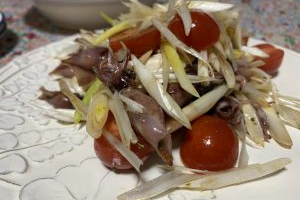 ウルイとホタルイカの燻製醤油和え